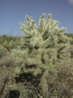 Chain-Fruit Cholla (Opuntia Fulgida). Fešák jakoby poskládaný z kaktusových článků do většího řetězu. (chain = řetěz). Každá článek odpovídá jednomu roku, na samém konci jsou květy a plody. Má i jiné jméno: "jumping cactus" - skákající kaktus. To proto, že jednotlivé články se ve styku s oděvem nebo zvířecí srstí pevně přichytí a lehce odlomí.