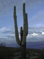 Mladý Saguáro, v pozadí košťovitý Ocotillo (Fouquieria splendens). Kvůli své duté konstrukci neudrží vlhkost. Proto je věčně holý. Listy mu narostou jen po dešti a záhy opět opadají. Krátké okamžiky využívá Ocotillo k intenzivnímu růstu.